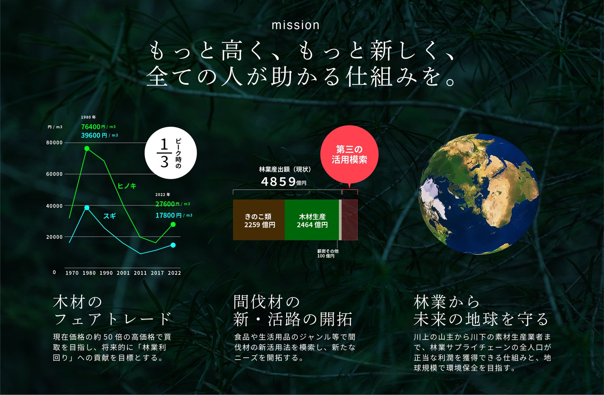 日本の国土は7割が山だが、木材自給率は41.8%。同時に多くの国産間伐材が、その価格の低さ故に市場に出ることなく放置されている。単に間伐材を使用するだけでは本質的な国産木材の需要創出には繋がらない。日本全国の林業従事者と直接取引する中で定めたフェアトレード価格に準じ、余剰間伐を正規価格で取引することで林業従事者を支援し、日本の林業の本来的な意味での活性化を目指す。