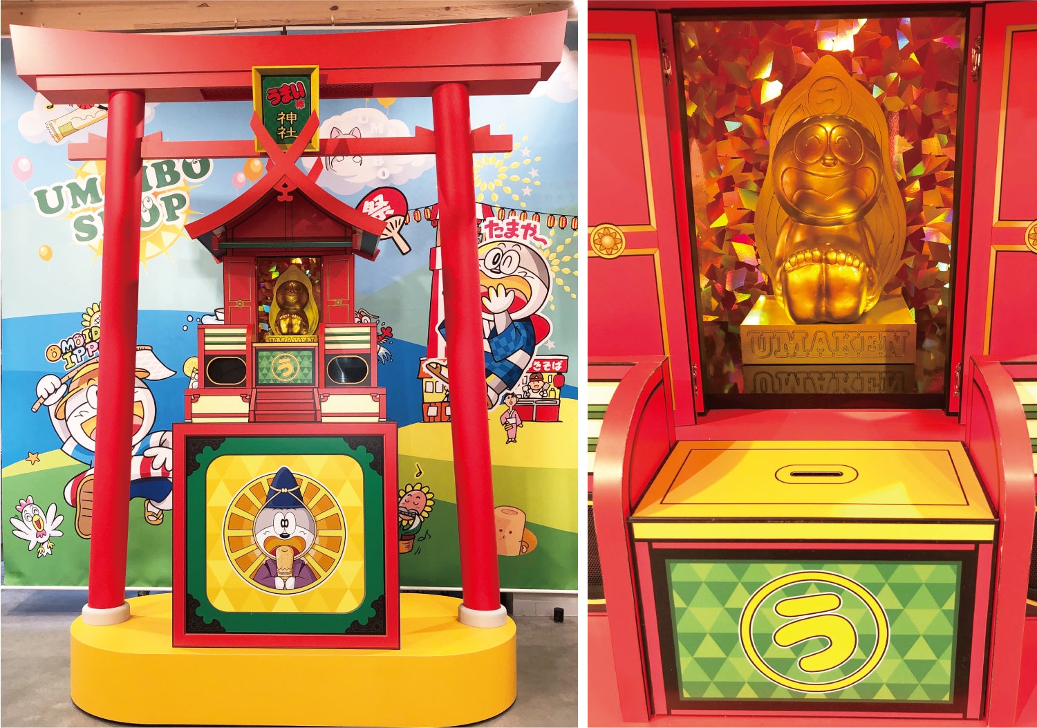 うまい棒カラーの鳥居の奥にはうまい棒神社?!なんと、うまい棒のキャラクター『うまえもん』が幸福の神様っぽくなって鎮座しております。お賽銭を入れるとうまえもんとうまえもんの妹うまみちゃんの声であなたの今日の運勢を教えてくれるかも?!神社と言えばお祭り!店内はお祭りをイメージした楽しい装飾となっており、千本引きやうまい棒おみくじ、輪投げ(イベント時のみ)など遊べる仕掛けがいっぱい。もちろん現代の駄菓子から懐かしい駄菓子も多数取り揃えて皆様のご来店をお待ちしております。
