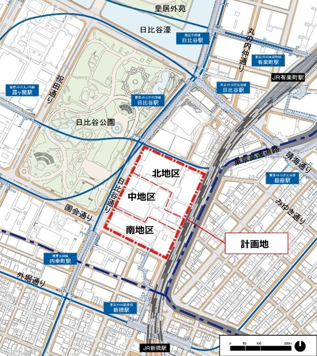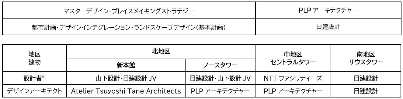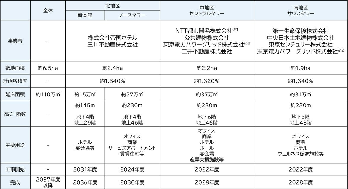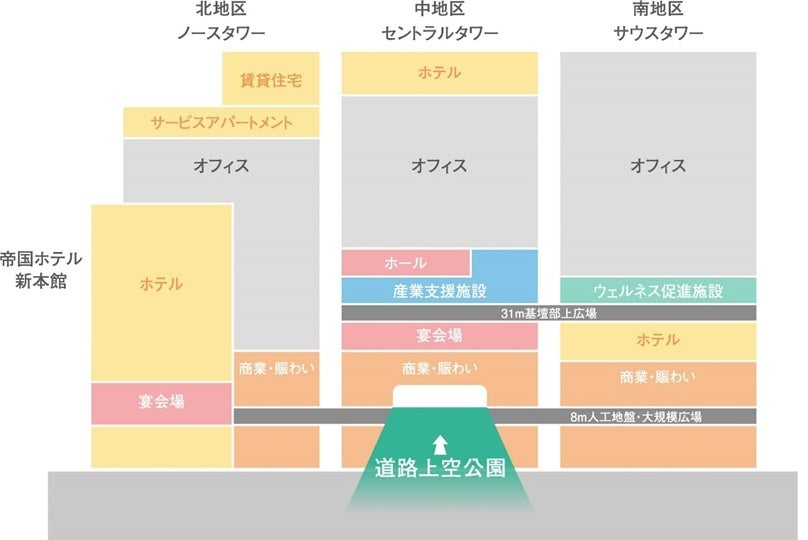 当街区は北地区・中地区・南地区の3つの地区で構成され、地区間が連携して一体的な街づくりを推進します。北地区には帝国ホテル新本館及び、オフィスや商業施設、サービスアパートメント、賃貸住宅等を備えたノースタワーを整備します。中地区にはオフィスやホテル、ホール、宴会場、産業支援施設等を備えたセントラルタワー、南地区にはオフィスやホテル、ウェルネス促進施設等からなるサウスタワーをそれぞれ整備します。
