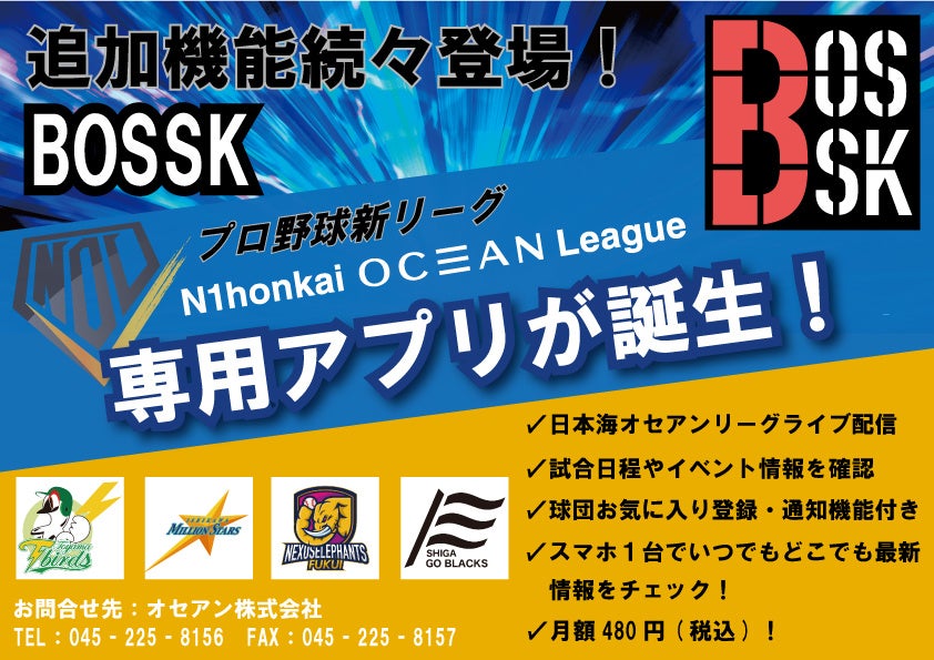 オセアン株式会社(本社:神奈川県横浜市 代表取締役社長:黒田)は、2022年4月2日(土)に開幕するプロ野球新リーグ「日本海オセアンリーグ」に向け、公式戦ライブ配信やチケット購入、イベント情報をお届けする配信アプリ【BOSSK】をリリース致しました。