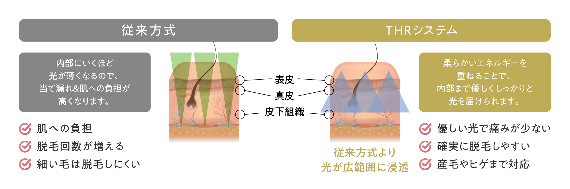 業務用メーカーとして、18年の実績をもとに開発した、独自技術「THRシステム」を家庭用に搭載。お肌に優しい光で負担を最小限に抑えつつ、剛毛から産毛まで、しっかりとしたお手入れが出来る独自技術です。