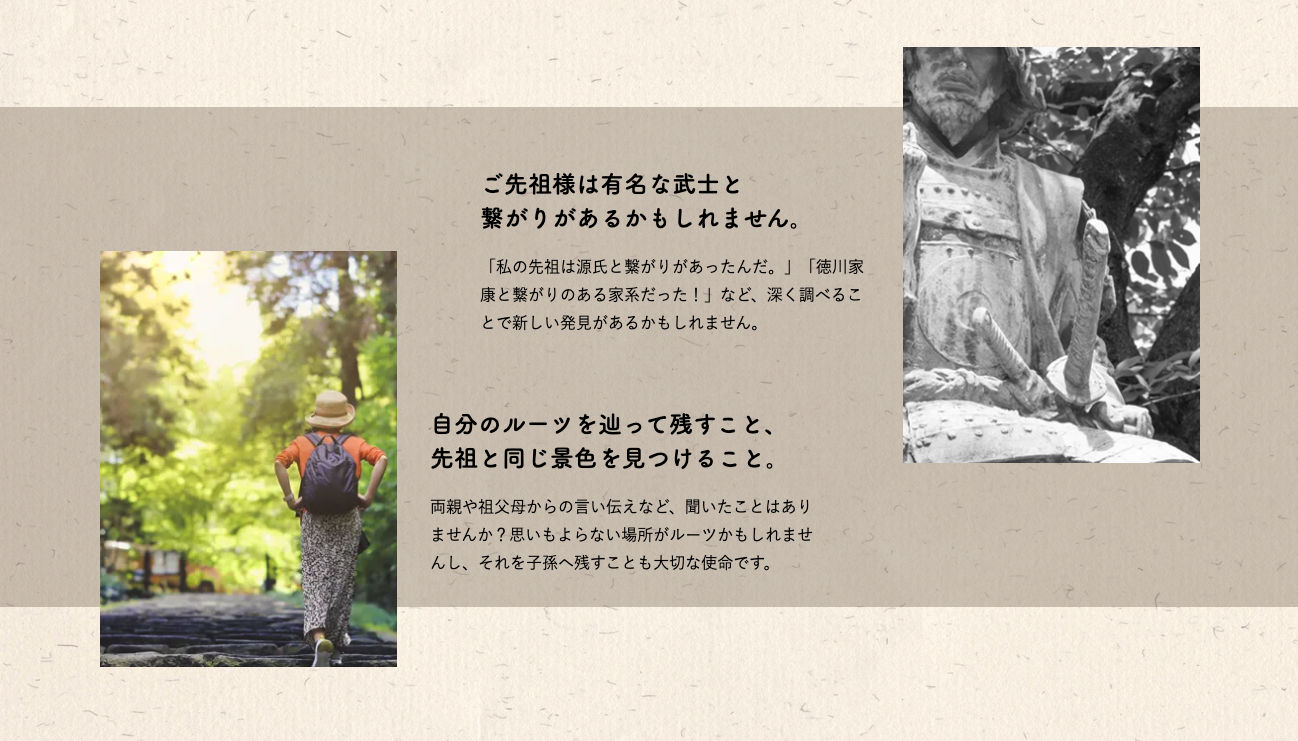 弊社では、史実には記されずとも縁をつないできた一般人のどなたでも、「自分のルーツ」を辿ることができればと考え、このサービスを始めました。