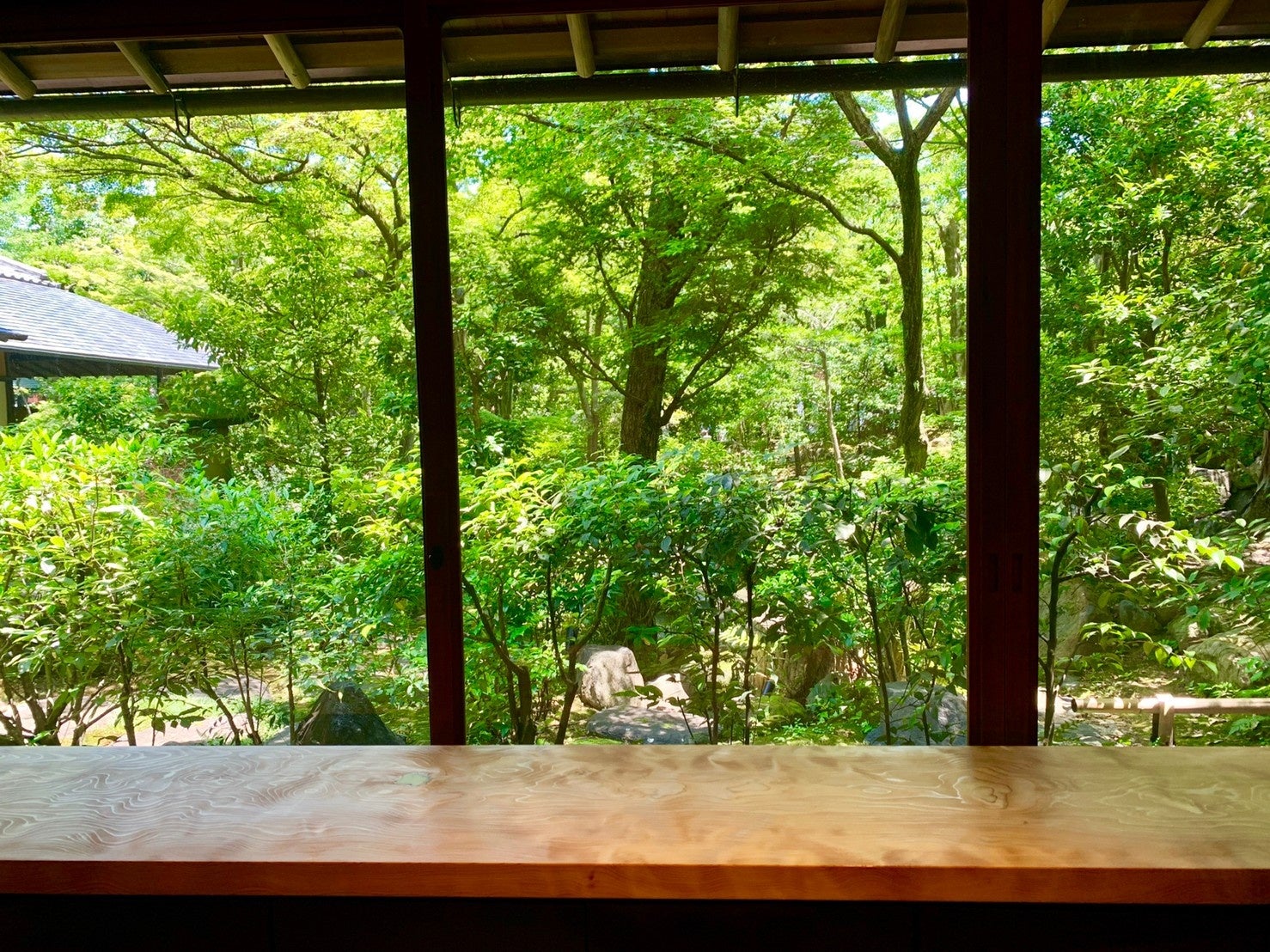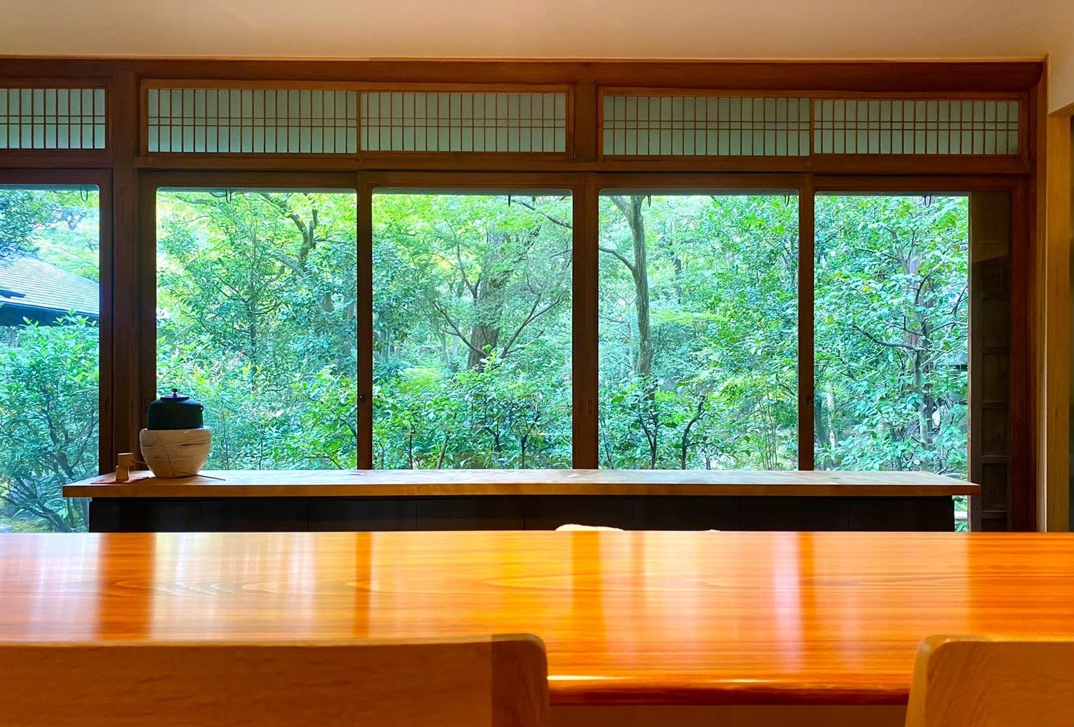 緑に包まれる食堂のカウンター席