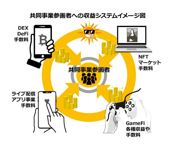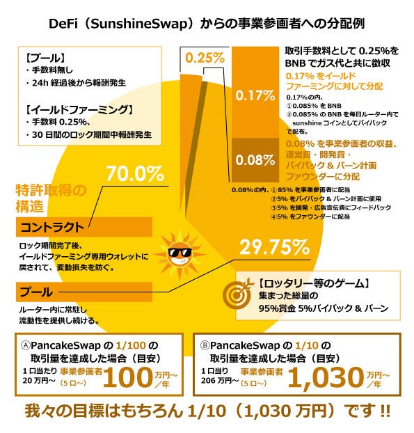 暗号資産プロジェクトを手掛ける、ディーピーエス・ジャパン合同会社(所在地:大阪府堺市中区深井沢町279-1、代表社員:村上雅彦)は、「DeFi(分散型金融)による壮大な経済圏を作るSunshine Project」のビジネスパートナー大募集します。ビジネスパートナーは、事業をすることはもちろん、それぞれがお金を出し合い(1万円から参画可能)、現在100名の方(規模として500万円)が参加しています。最終的には1800万円の規模を限度と考えています。