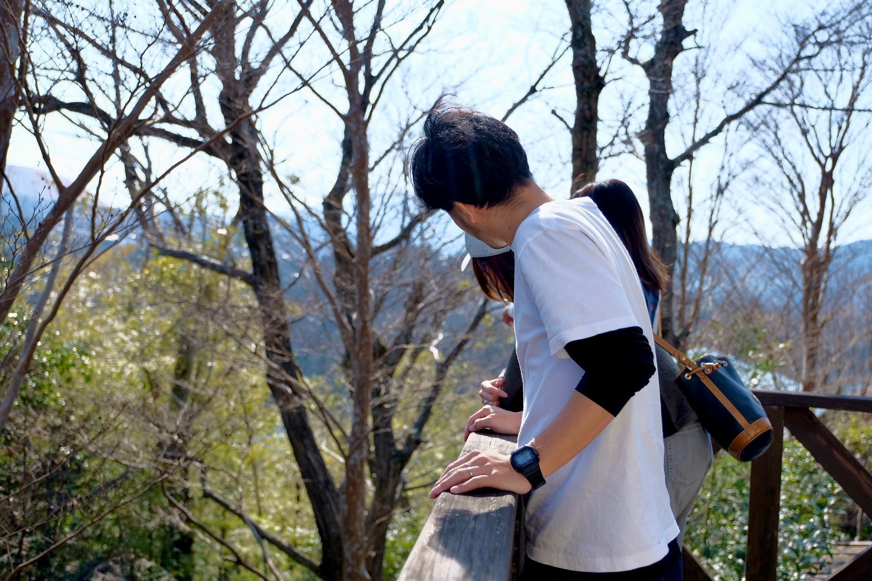 外に向かう広い間口から、伊豆の自然を見渡す –
