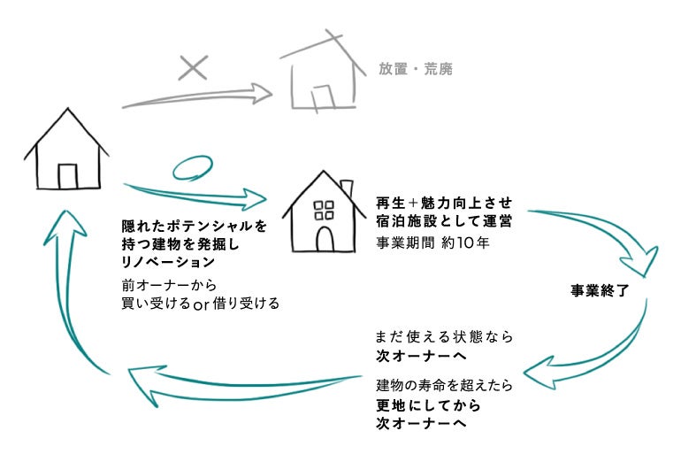 家を拠点にした旅で、人に出会い、自然に触れ、自己の感覚を開放する。家の命を守ることが、周りの地域を守ることに繋がる。空き家だった空間から、みんなの毎日の中に、良い循環が生まれていきます。