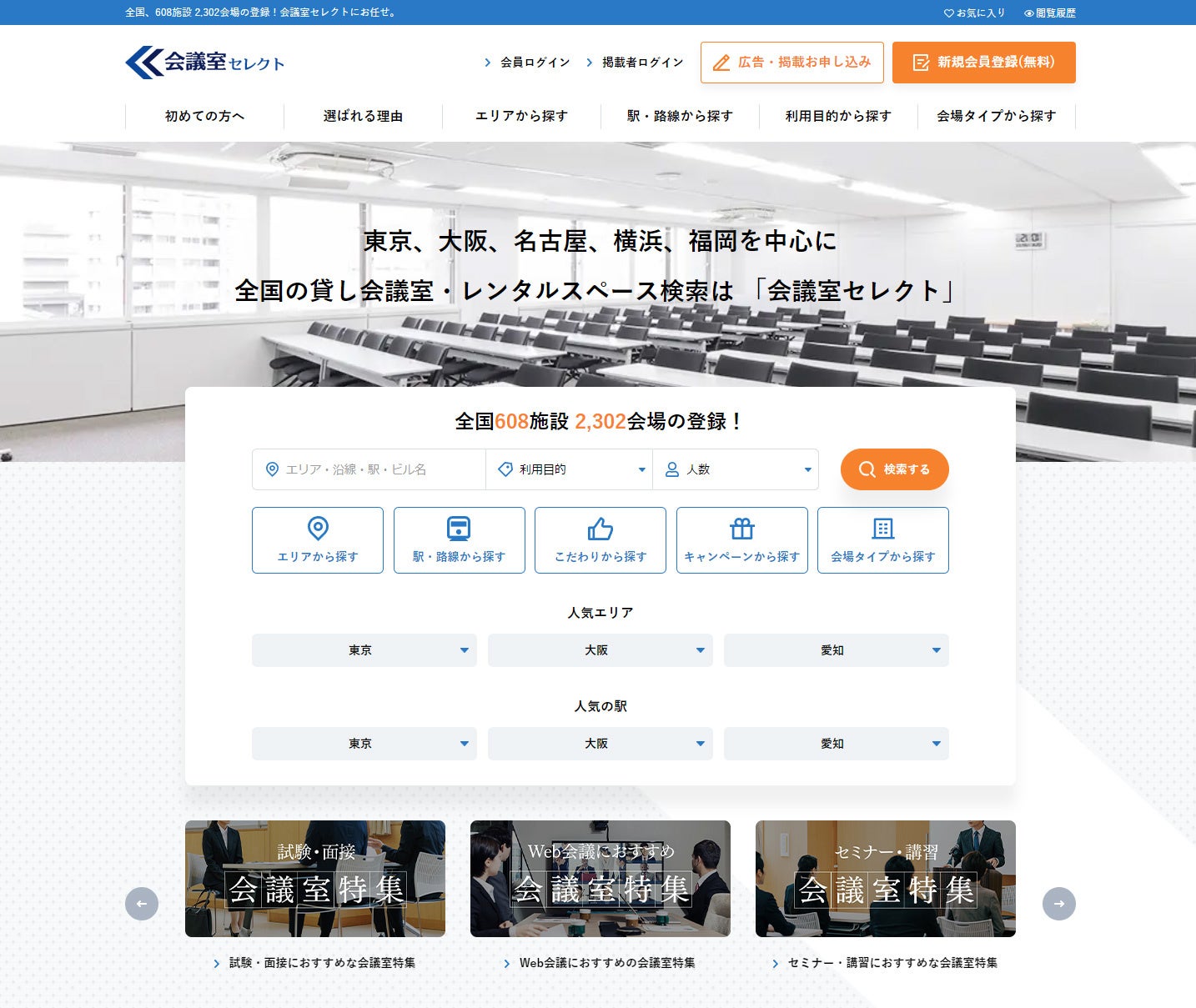 東京、大阪、名古屋をはじめ全国の貸会議室情報を掲載しており、お客様のニーズに合った会議室を探しやすく「貸したい」と「借りたい」を繋ぎます。