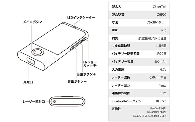 CheerTok(チアトック)とは、エアマウス、ワイヤレスタッチパッド、プレゼンター、レーザーポインター、ショートカットジェネレーターを組み合わせた、あらゆるデバイスのための完璧な小型リモコンです!