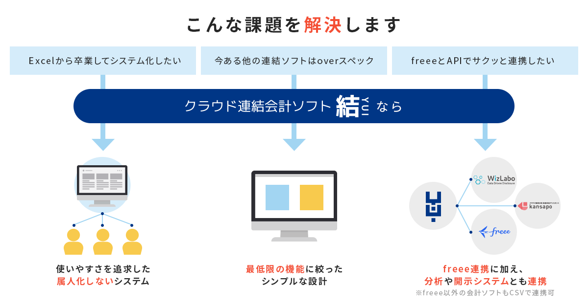 クラウド連結会計ソフト結/YUIは、freeeのAPIを活用し、手作業による転記不要で連結パッケージを作成することができます。