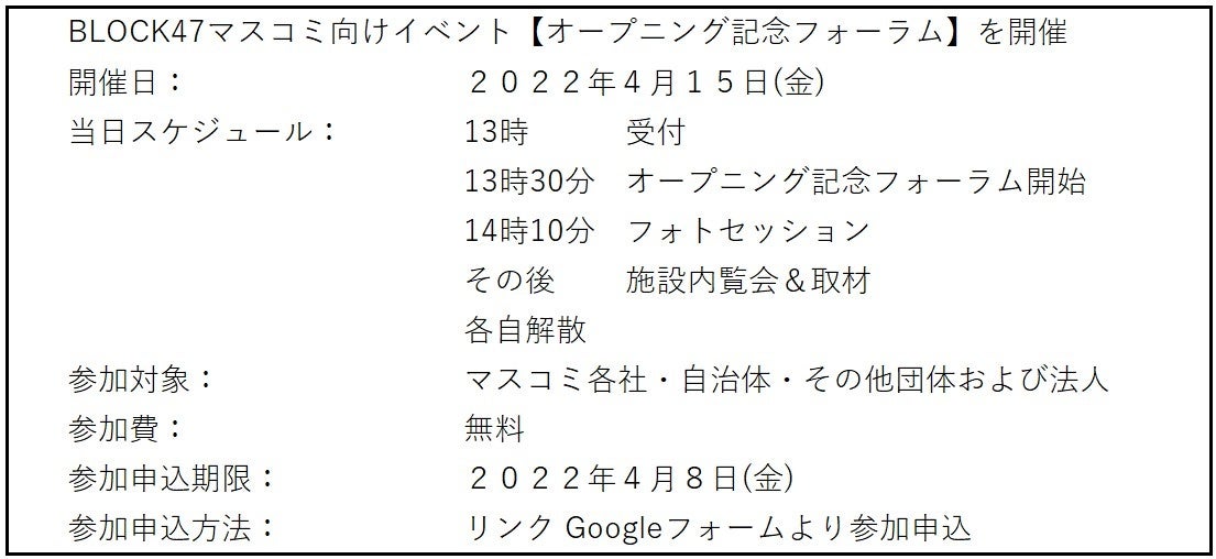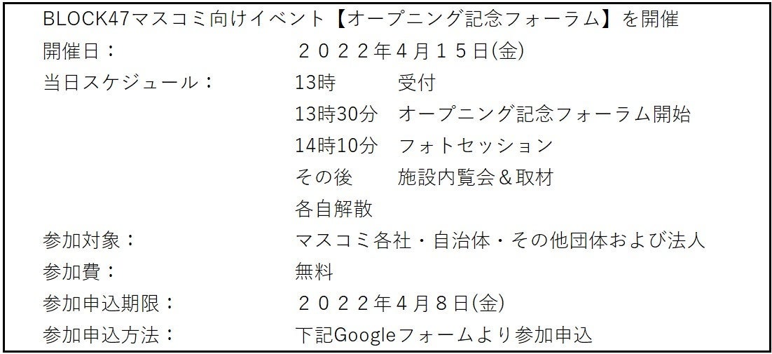 またグランドオープンに先駆けて、マスコミおよび各種団体向けに前もっての申込み制で「BLOCK47」のことを知っていただくために「オープニング記念フォーラム」を開催致しますので、ぜひ施設への興味のある団体、施設との連携に興味のある団体についてはぜひご参加ください。