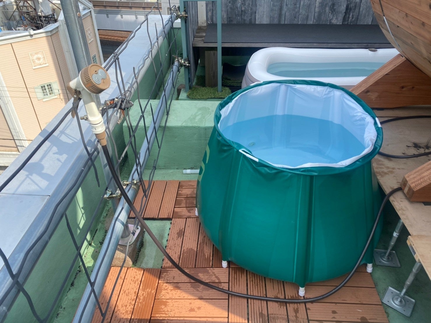 寝そべりながら景色も楽しめる水風呂と、しっかり肩までつかれる円柱型の水風呂の2種類をご用意しています。