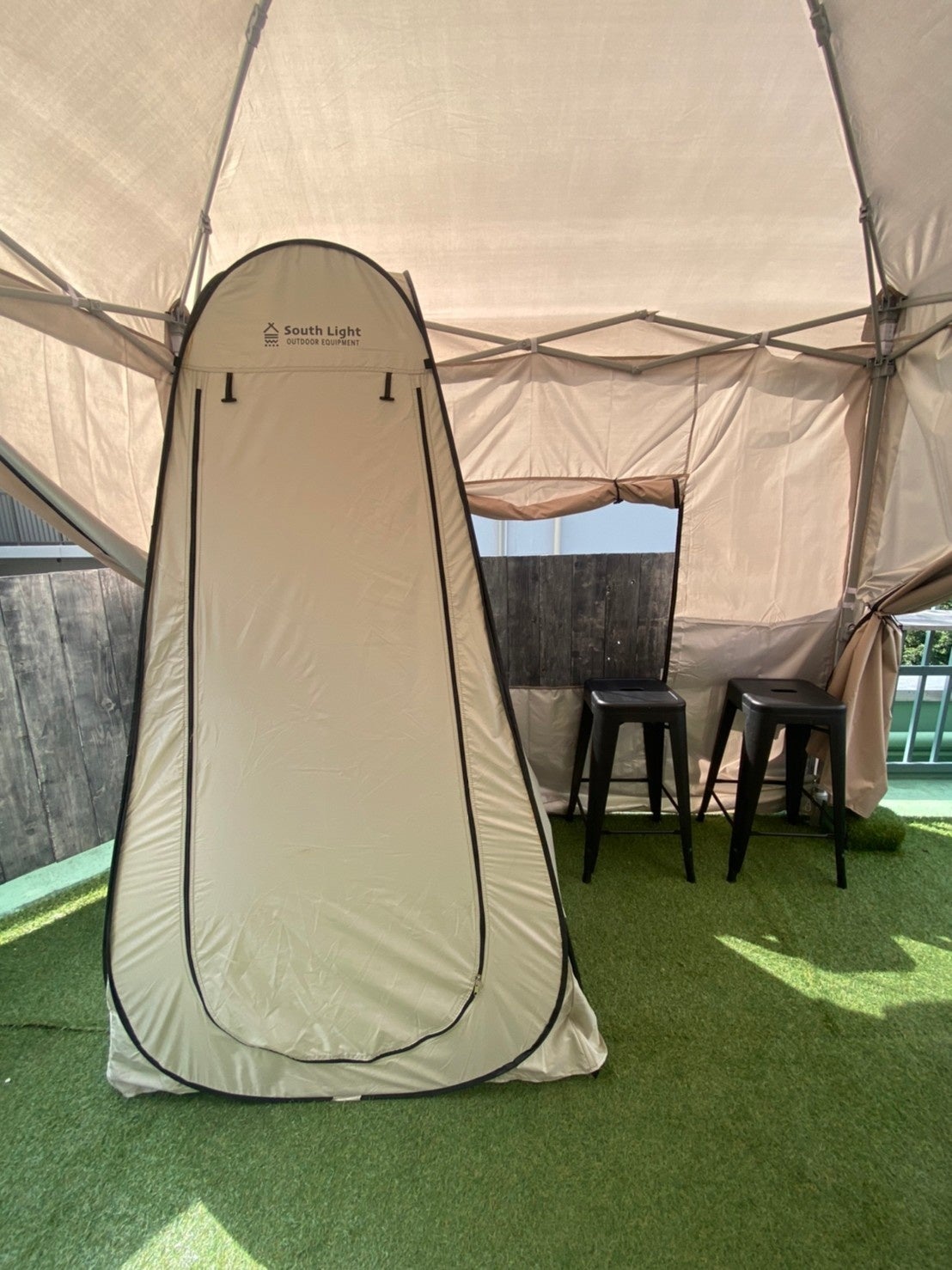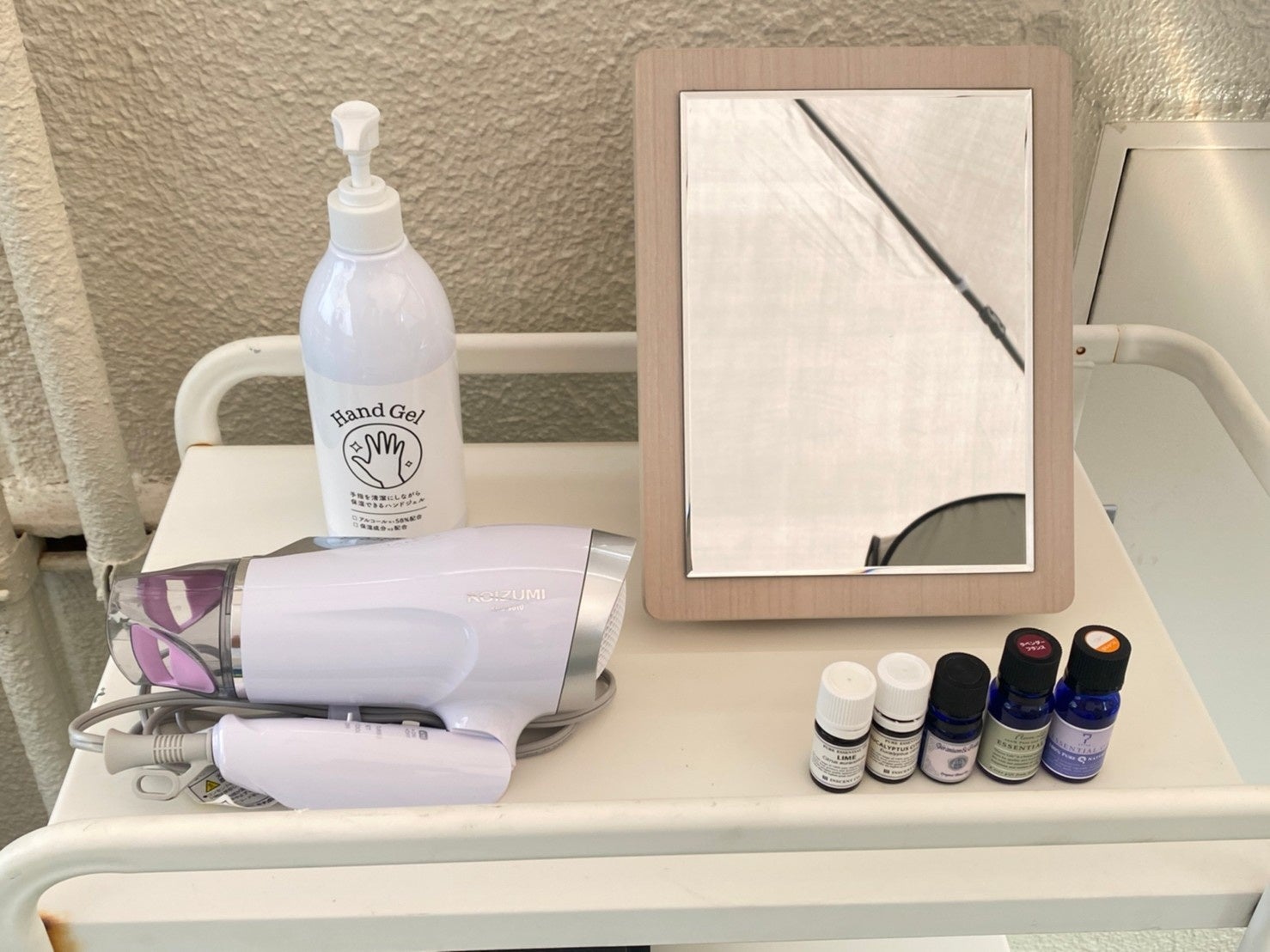 着替えスペース、ドライヤーや鏡も用意しています。ご利用後の身だしなみを整えることができます。