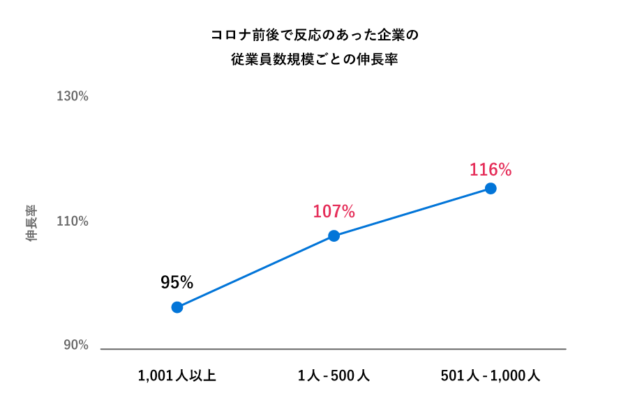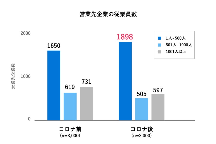 営業先企業の従業員数のデータによると、コロナ前は⼤⼿企業(従業員が1,000⼈以上)の企業への送信が中⼼的だったのに対し、コロナ後は中⼩企業、特に1⼈~500⼈以下の従業員規模の中小企業へのアプローチ数増加が顕著になっています。