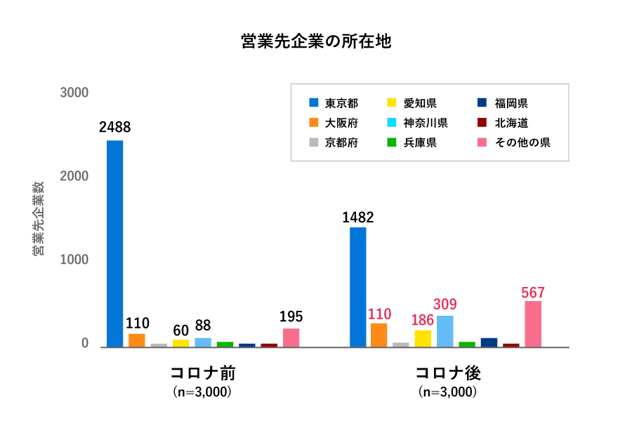 MAツールでアプローチされた企業の営業所所在地を見てみると、コロナ前は東京を中⼼としていたのに対し、コロナ後は地⽅都市(⼤阪、愛知、神奈川など)や他県への送信が増えており、訪問を必要としないアプローチの実現により、企業の新規開拓におけるターゲットエリアの拡大が見られます。
