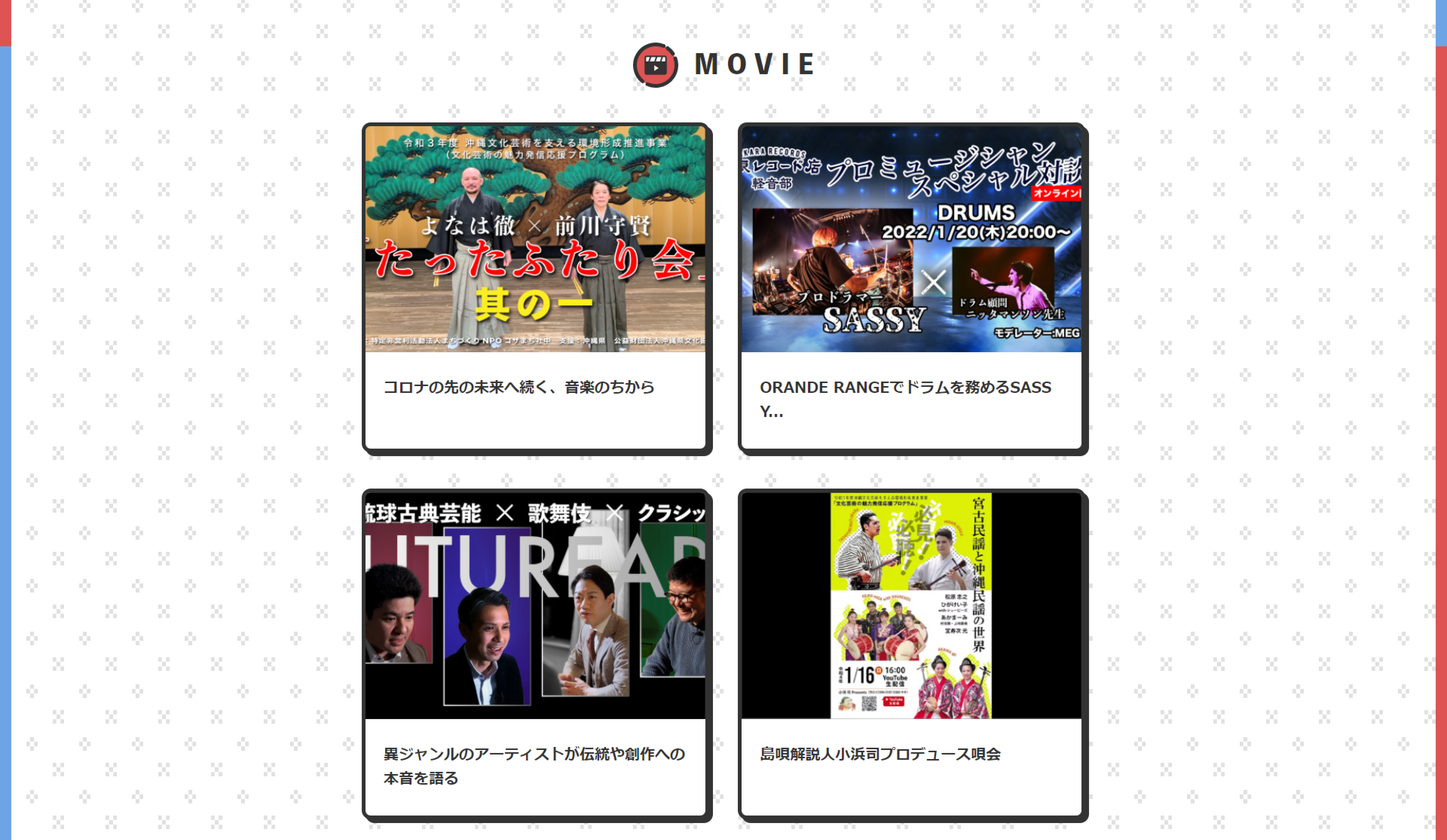 昨今の社会情勢の影響を受け、沖縄県内でも様々な文化芸術活動が中止・延期等を余儀なくされました。文化芸術活動者の活動の発表・発信の場を提供し、文化芸術活動の維持・発展を図るとともに、県民が文化芸術に触れる機会を提供することを目的にサイトを開設いたしました。