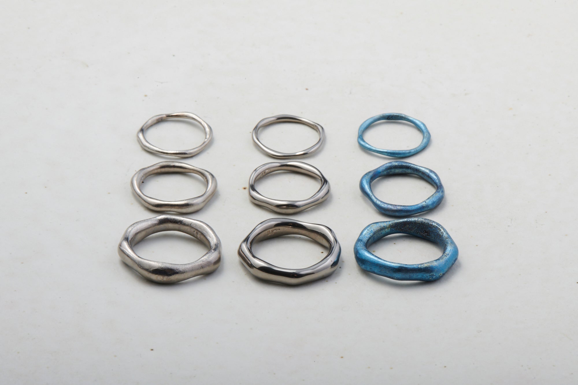 チタン鋳造の製造⼯程の中に現れる3つの表現と、線の太さや厚みを変化させた3デザインを掛け合わせ、計9種類のプロダクトを展開。重ねづけしたり、組み合わせて着⽤していくことでお⼀⼈お⼀⼈の「あるがまま」を形成します。