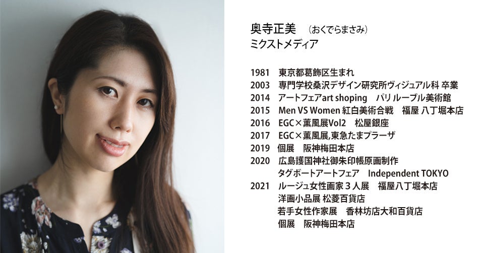 京都在住の日本画家。日本画で素朴な自然描写の中に独自の色彩と心象とが融合した作風。夜景作品にも好評を博しています。風景を通して内面の心象を表現。洋画のように塗り重ね、色相で魅せる作風で夕陽や水面、木漏れ日などゆらぎや移ろいというテーマに挑み続け、近年は滝やうさぎ、こもれびシリーズなどの幅の広い作品制作に力を入れています。