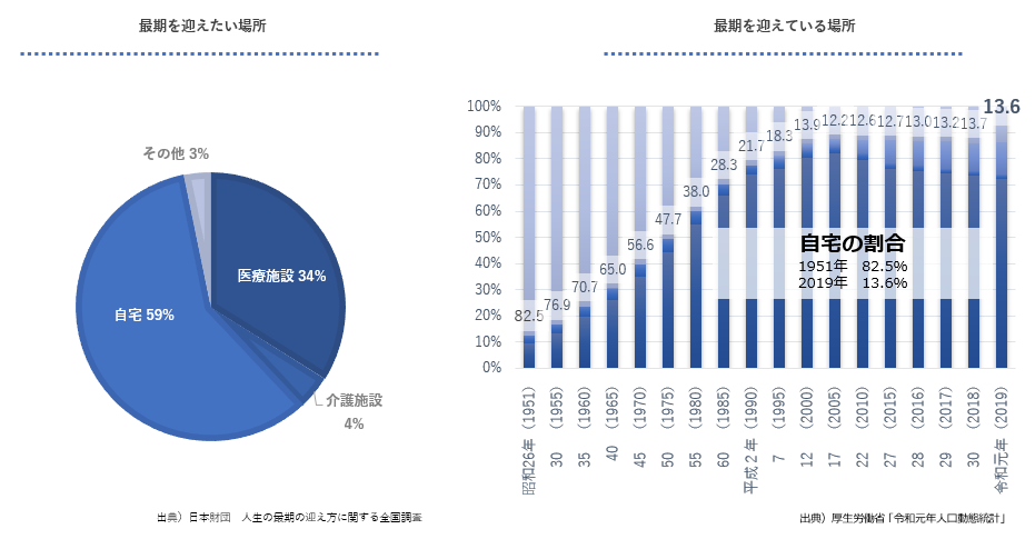 また、自宅で最期を迎えたいと考えている人びとが全体の59%に対して、自宅以外で亡くなっている人が86%という現実があり、解決策となる在宅医療は「構造的な課題」を抱えています。