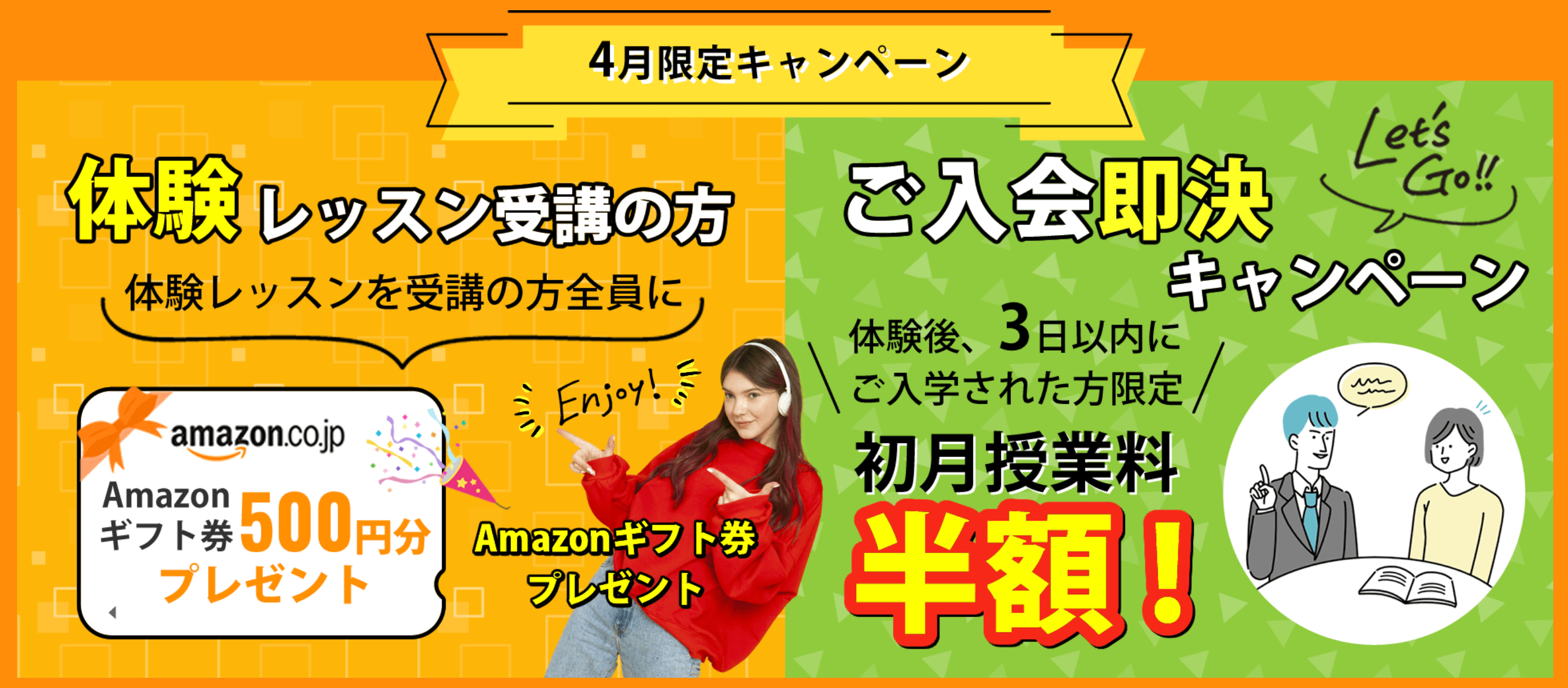 OECランゲージサービスは2022年4月限定で英会話体験レッスンを受講の方、全員にアマゾンギフト券500円分プレゼントいたします。また体験後、3日以内にご入学された方限定で『初月授業料半額』とさせて頂きます。