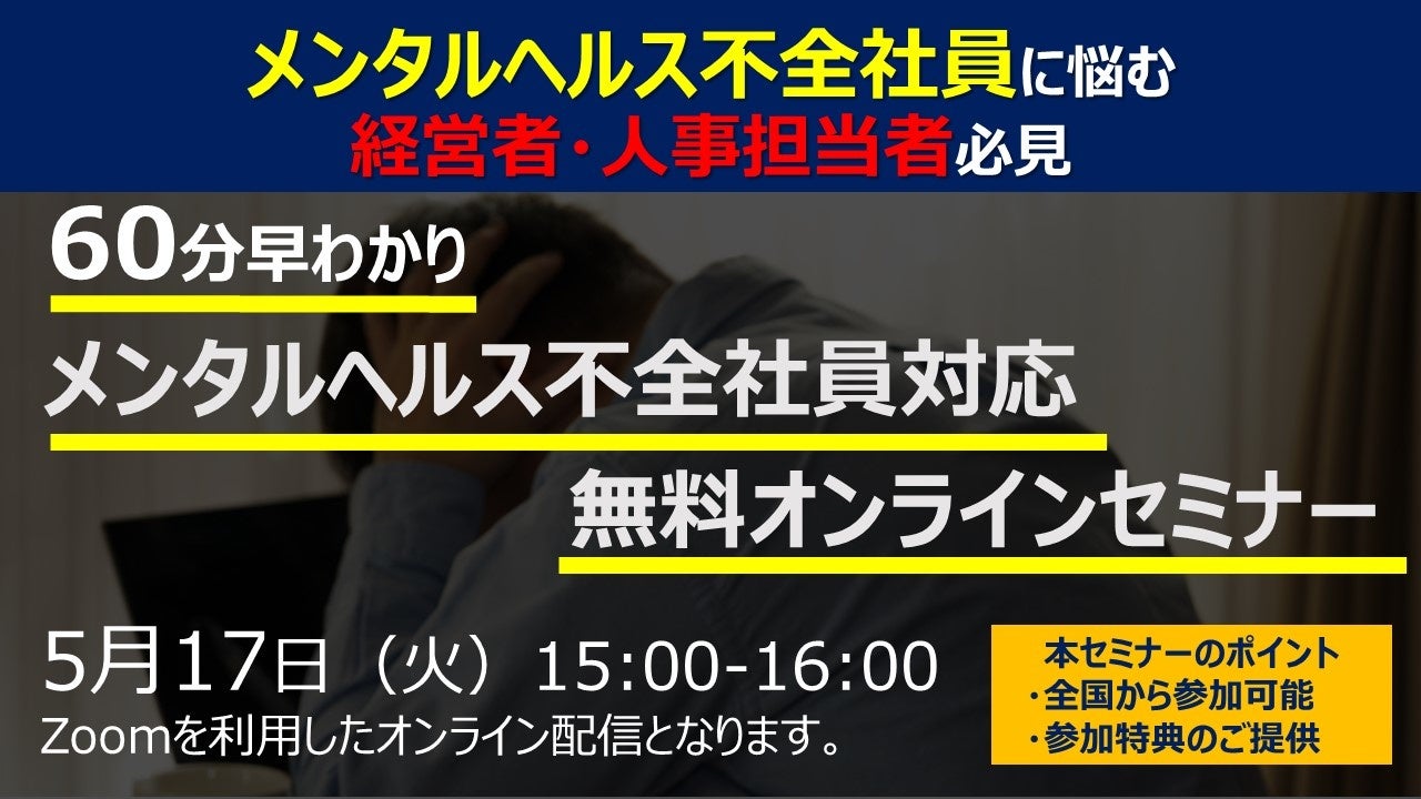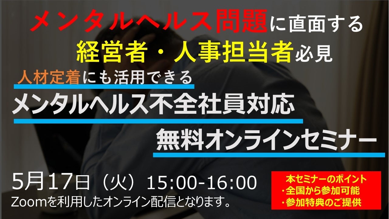 『メンタルヘルス不全社員対応セミナー(無料・オンライン)』を5月17日(水)に開催いたします。