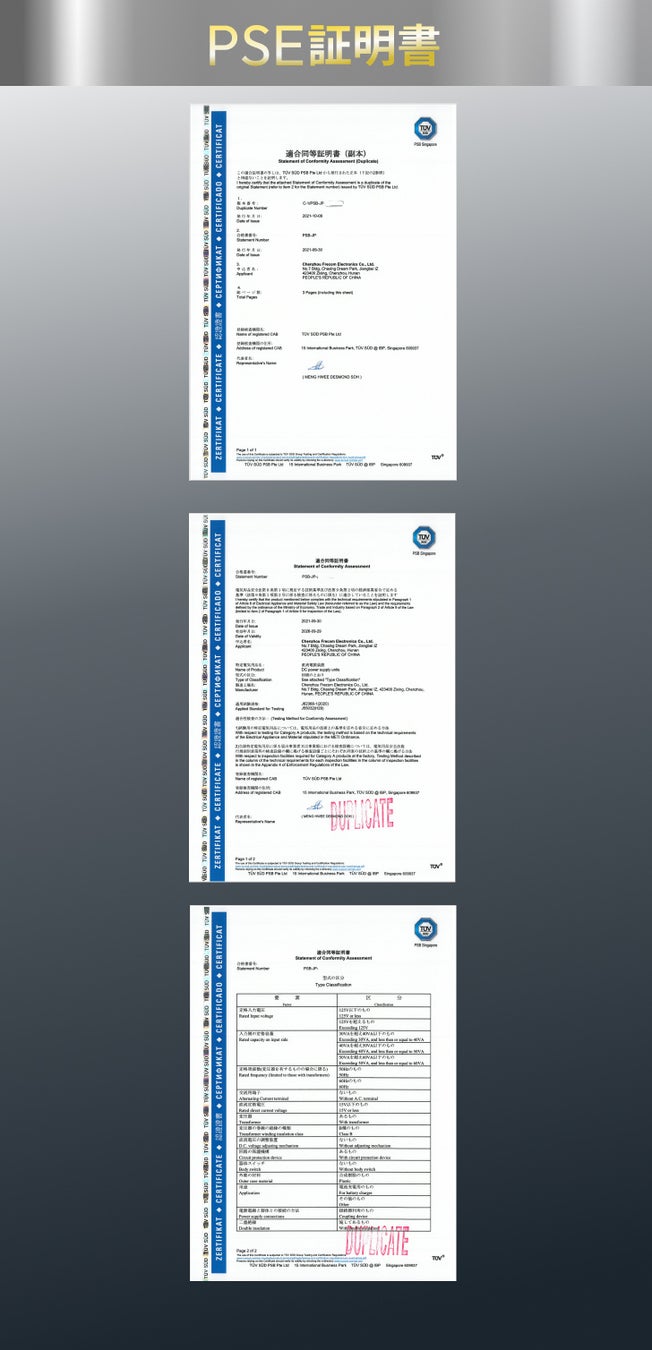 ・PSE取得済み、電気用品安全法に基づく技術基準の適合性検査に合格しています。
