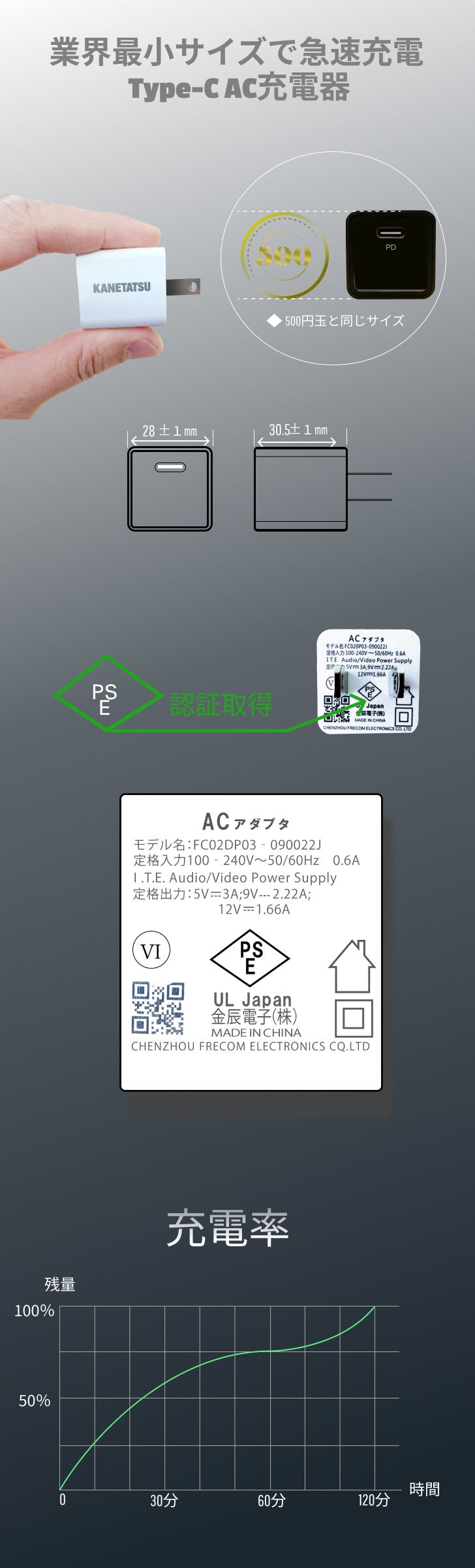 ・KANETATSU親会社Frecomの方、業界最小サイズ品のPD(パワーデリバリー)20W品の充電器の自ら設計・生産・PSE安全規格申請・販売を一貫して、ユーザー様へ直接に販売は初の試みです。