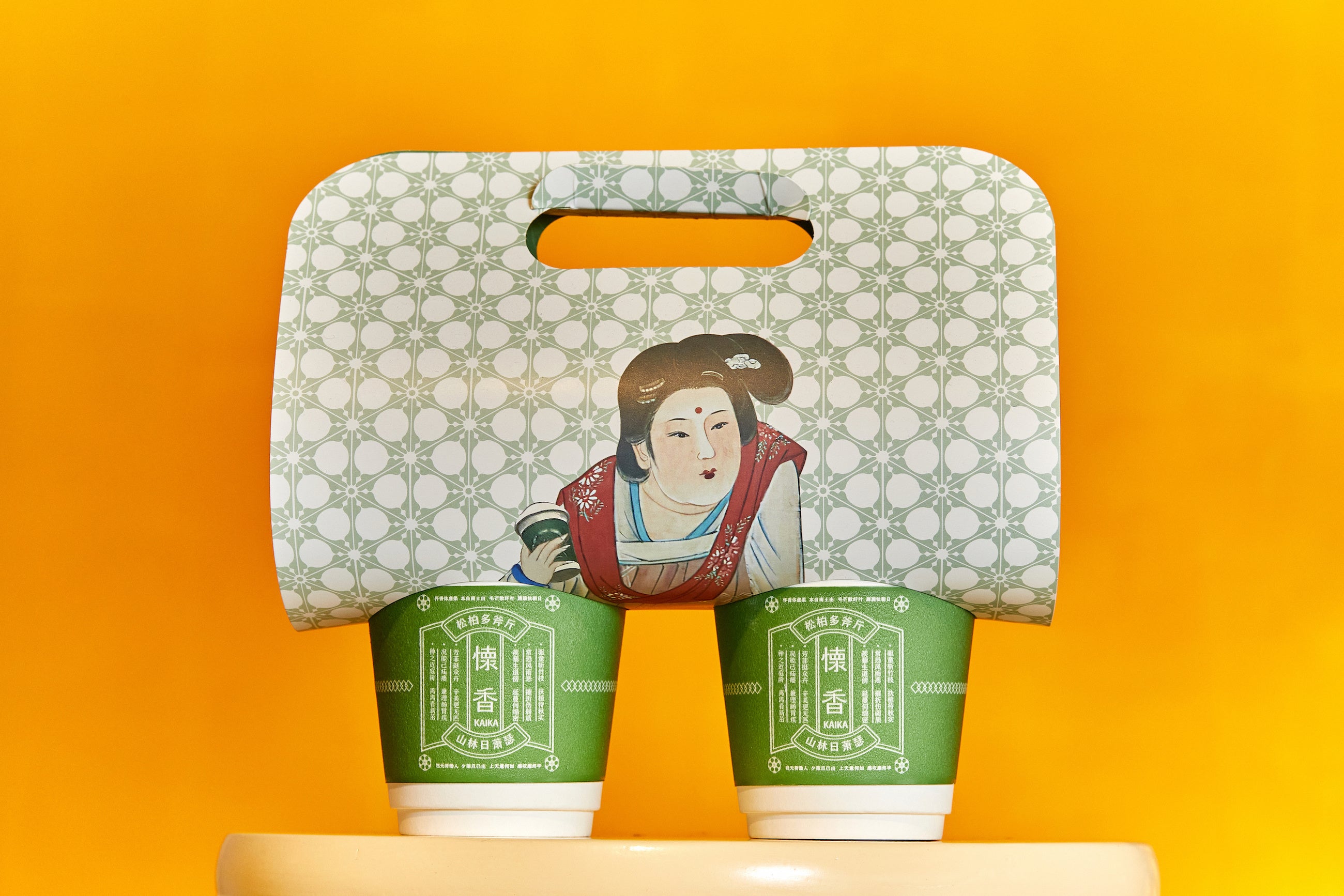 テイクアウェイのパッケージ。ドリンク2杯ご注文でご希望の場合は、持ち歩きできるホルダー