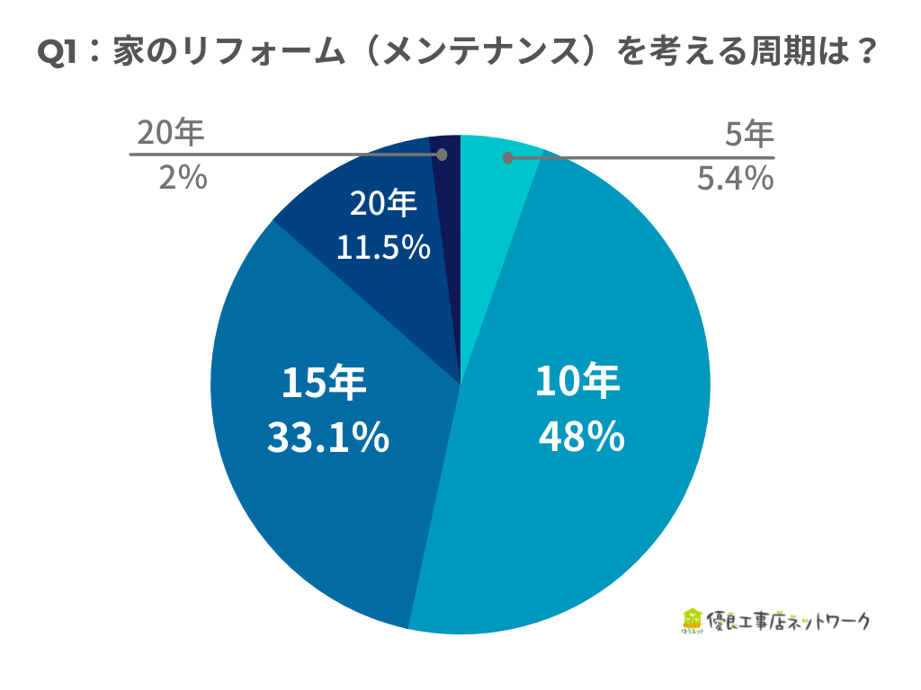 家のリフォームは外壁が10年、水廻りは15年などリフォーム・メンテナンスの目安に差があるものの、約8割の職人が「10年〜15年周期」が理想だと回答。