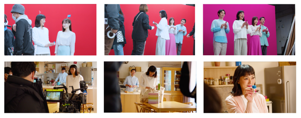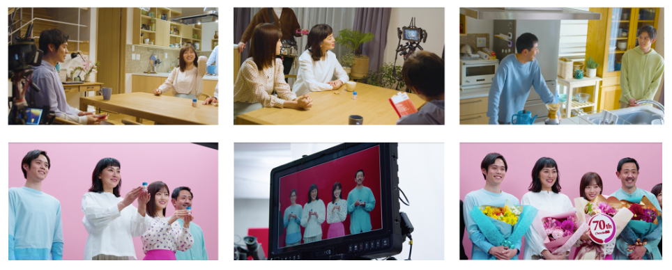 家族が揃って製品を持つシーンでは、板谷さんから直々に指導が。手の添え方や製品の角度など、製品が一番良く見える持ち方を、山下さん、細田さん、濱津さんに教えていました。キラキラとした表情で「なるほど」と頷きながら聞いている山下さん、細田さんと、優しく指導する板谷さんの姿はまるで本物の親子そのものでした。