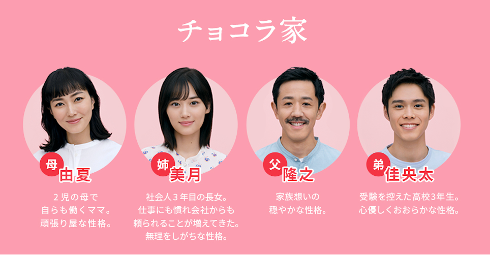 新TVCMには母親役として板谷由夏さん、娘役に山下美月さん、父親役として濱津隆之さん、息子役に細田佳央太さんを新たに起用。「チョコラ家」の4人がお互いをさりげなく気遣う、温かい家族愛に注目です。