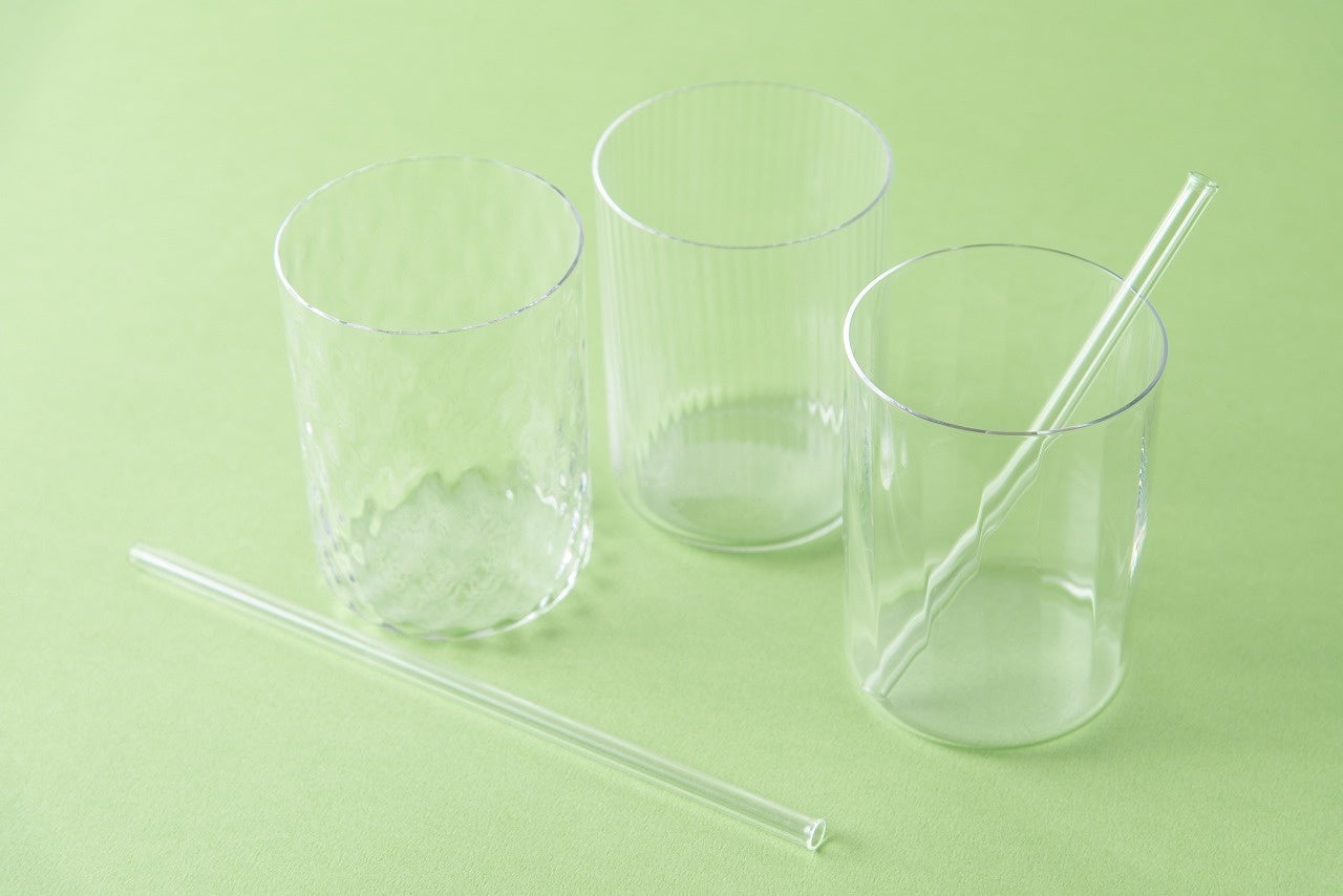 松徳硝子×AKOMEYA TOKYO グラス(千本・縞紋・格子) ¥2,420/廣田硝子ストロー 大 ¥880/廣田硝子ストロー 小 ¥660
