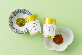 和歌山県産のぶどう山椒を石臼でひいた紀州石臼挽き山椒粉。そして同じく和歌山の大粒ぶどう山椒と辛さの中に甘みのある国産鷹の爪唐辛子2種をブレンドした二味。どちらも汁ものやお魚料理などにかけるだけで山椒の香りと味わいが花開きます。
