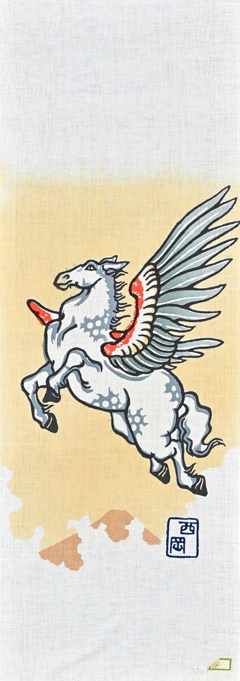 ギリシア神話に登場するペガサスを富士山を背景に描いたデザイン。