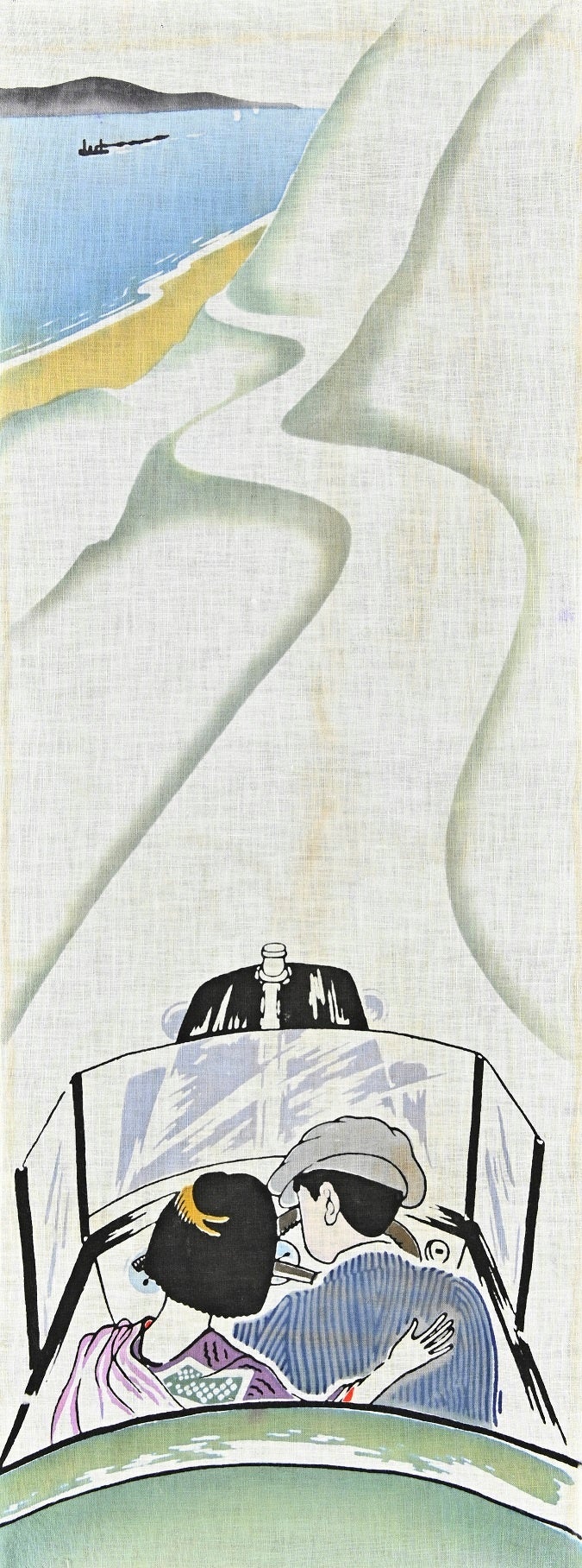 海岸線か湖か。最新の自動車(オープンカー)に乗りドライブする若い男女。運転席の男性、助手席の女性の衣装に時代を感じさせる。