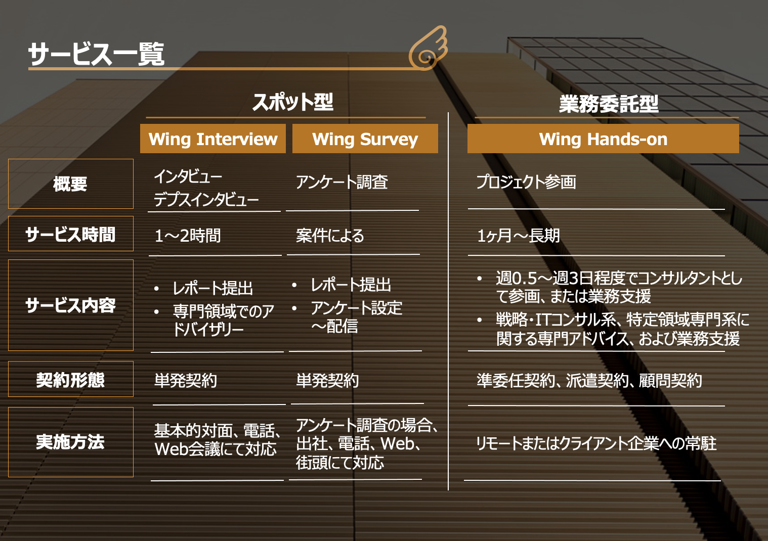 ・運営会社がコンサルティングファームという強みを活かしたアンケート調査やインタビューの設問設定業務代行