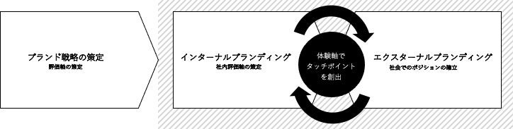 EXPERIENCE DRIVINGは、企業や組織の存在意義(パーパス)を見直すことで、企業や組織が大事にする価値観と社会的課題の解決策をリンクさせることで社会的意義を再発見します。発見した社会的意義を軸に組織内部に向けたインターナルブランディングと、外部に向けたエクスターナルブランディングを短期間で交互に実施することで理念開発・理念浸透およびその効果の可視化・体系化を可能にします。また、社員がドライビングの主体者となり、実践を通じた気づきを経験として積み重ねることで、「組織の力」を高めていくことに寄与します。