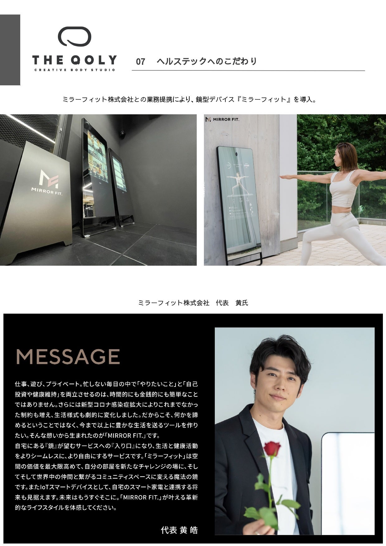 THE QOLYでは、現代のヘルステックを積極的に取り入れております。 グループトレーニングではPOLAR社製の心拍センサーを装着し、グループトレーニングエリア内の液晶ディスプレイにてリアルタイムでご自分の消費カロリーと心拍数を確認することができます。 自分がどれだけ頑張れているのか、確認しながらプログラムとリンクしていきます。 また、鏡型デバイスのMIRROR FIT.導入店においては最新のデバイスを直接体験することができます。 次世代型トレーニングを存分にお楽しみください。
