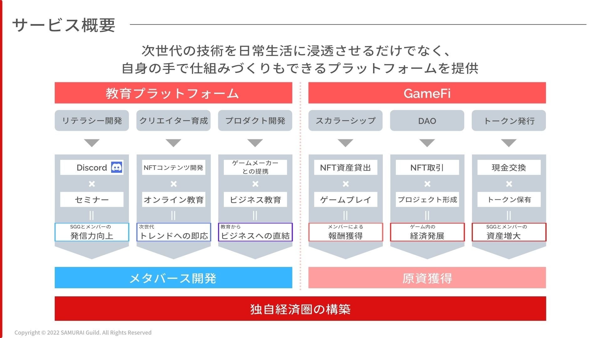 「Samurai Guild Games」は、ギルドメンバーに対し様々な情報や学びを提供します。ギルド内に“クリエイターを育成”し、ゲーム会社との連携を行うことで、“プロダクト開発”などの活躍の場を作ります。GameFiにおいては、スカラーシップ制度の実施、トークンの発行を予定しています。