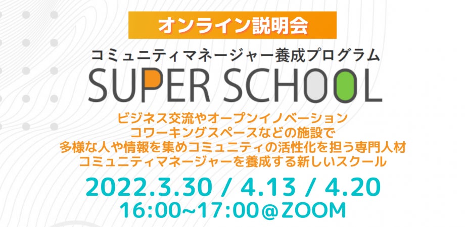 株式会社スーパーステーション(本社:大阪市北区、代表:野村 卓也)は、2022年5月21日(土)から、コミュニティマネージャー養成プログラム「SUPER SCHOOL」を開校します。
