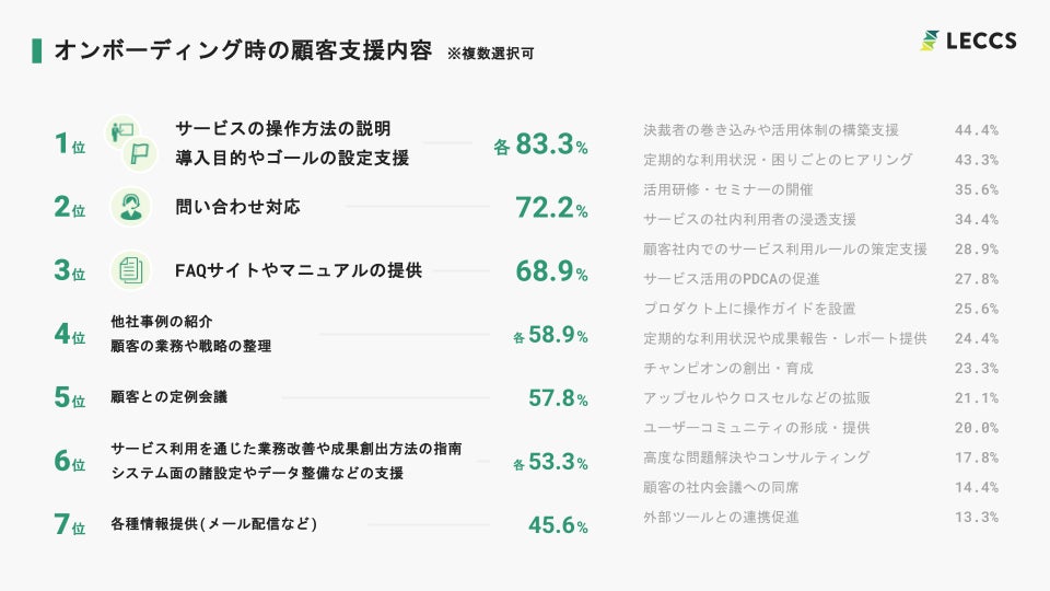オンボーディング時の支援は「サービスの操作方法の説明」と「導入目的やゴールの設定支援」が最多の83.3%