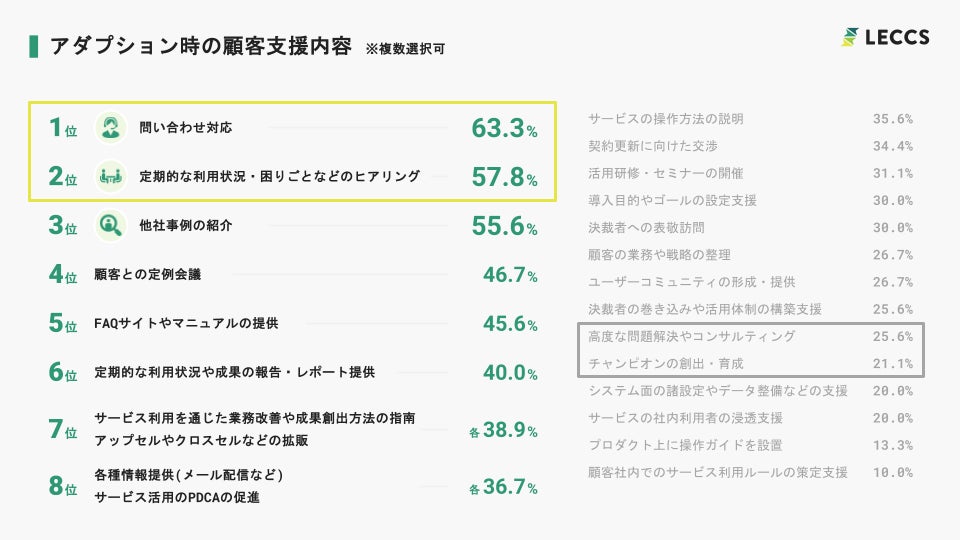 アダプション時には、問い合わせ対応(63.3%)や定期的なヒアリング(57.8 %)を中心に、顧客との接点を維持する努力が見られます。しかし、高度な問題解決やコンサルティング(25.6%)、チャンピオンの育成(21.1%)など、より踏み込んだ支援の実施率は低い傾向にあります。