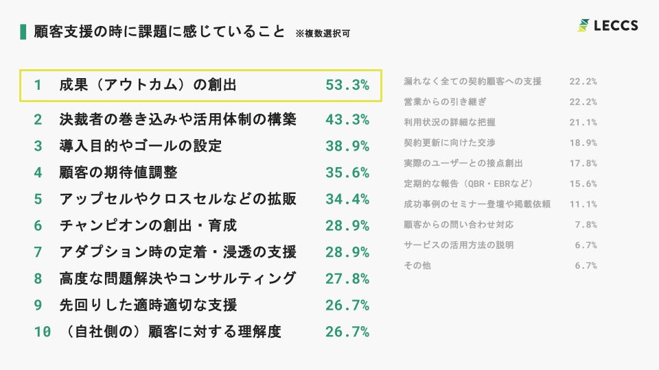 カスタマーサクセス担当者が顧客支援において感じている課題は「成果(アウトカム)の創出」が最多の53.3%