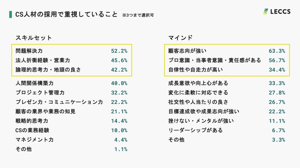 カスタマーサクセス人材の採用時に重視するスキルセットは、1位「問題解決力」2位「法人折衝経験・営業力」3位「論理的思考力・地頭の良さ」