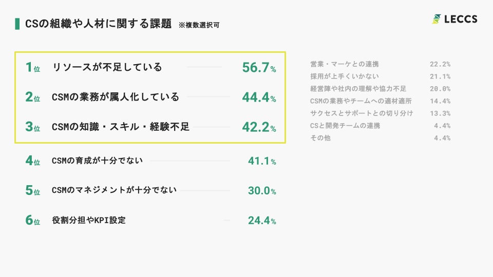 組織や人材に関する課題について質問したところ、「リソースが不足している」が最も多い回答となりました。カスタマーサクセス人材に求められるスキルセットが高度化・多様化する中、どの組織もリソース不足で、新人教育やマネジメント経験が進まず人材育成に苦戦していることがわかります。