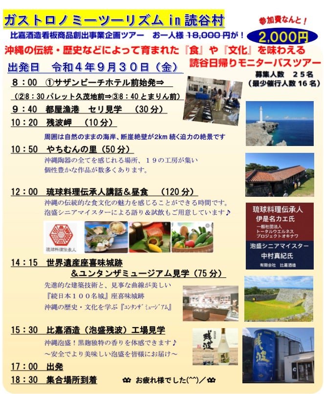 沖縄・読谷村(よみたん)日帰りモニターバスツアー募集開始!【2022年9月30日(金)実施!】