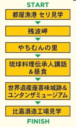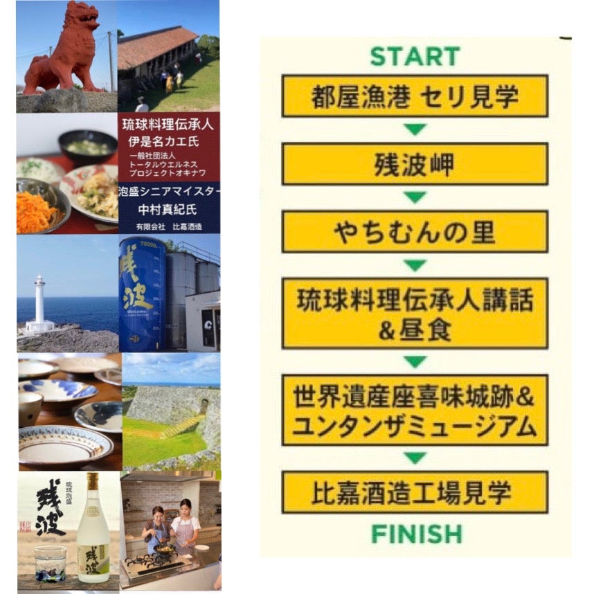 ▶︎読谷村の景勝地や地域名産を見学、▶︎琉球料理伝承人による講和&昼食で沖縄の食文化を堪能!▶︎泡盛工場の見学&試飲! など盛りだくさんの内容となっています♪