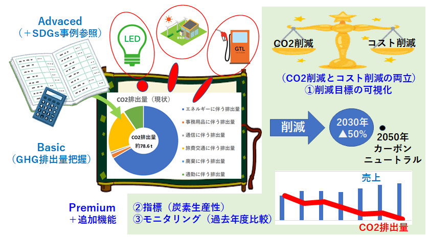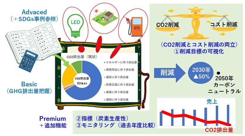 昨年12月にリリースした環進帳(Basic版)では、経理システムの会計情報のデータ(電気料金や燃料費、通信費や出張旅費、原材料費など)を読み込み、勘定科目からスコープ1・2・3(スコープ3は会計情報に現れる上流工程のみの算出となります)のCO2排出量を算出します。Advance版では、科目別にCO2削減の参考となるSDGs事例を表示する機能を有していました。今回リリースしたPremium版は、コスト削減の導入事例、コスト削減効果を表示し、SDGsの視点からの対応等に係る要望に応えています。より利便性と機能性を向上させ、かつデータ保有も3年以上という環境の構築を図りました。 具体的には、