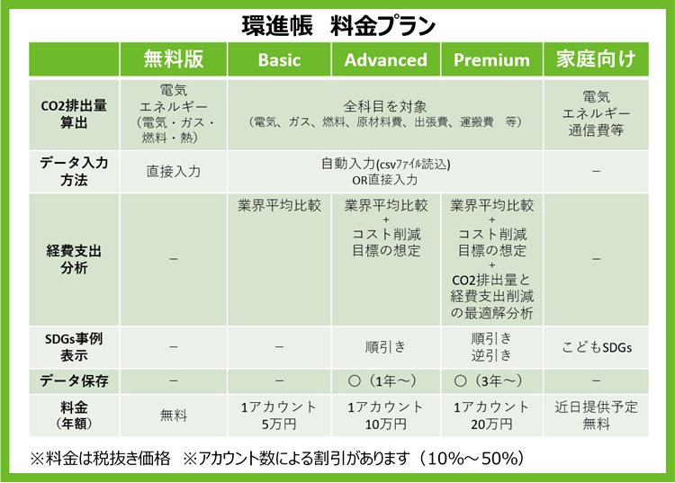 脱炭素経営を支援するクラウドサービス「環進帳」Premium版をリリースしました~CO2排出量の算定と可視化、削減効果の計算および事例の参照が可能~