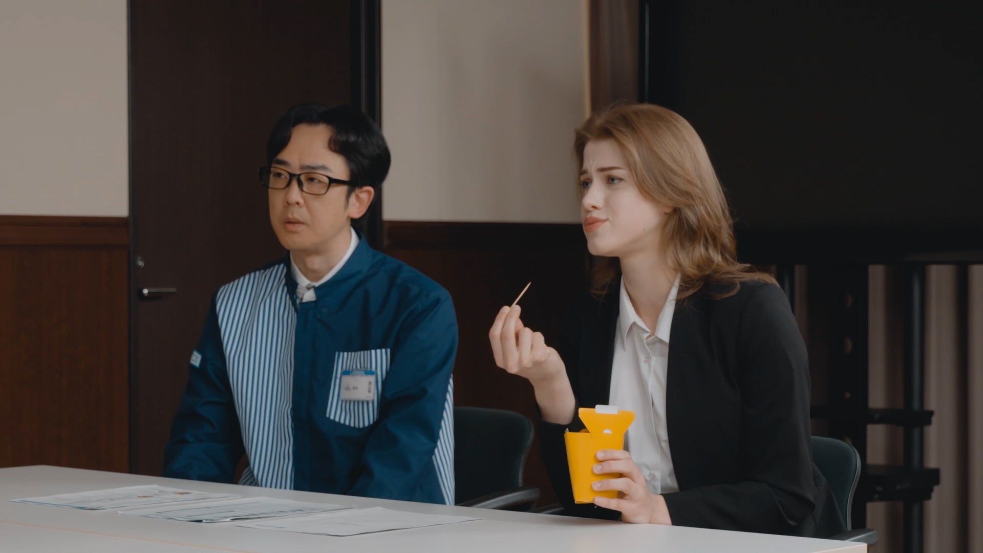 会議室で「からあげクン」新商品の説明を受ける梅沢さんが、ローソンのスタッフや謎の外国人女性、最後はまさかのドローンにまで翻弄される、全4話のシリーズです。4月12日(火)には第1話から第3話を公開し、新商品の答えがわかる最終話は4月19日(火)より公開します。TVCMも同日より東名阪をのぞく全国でOAします。