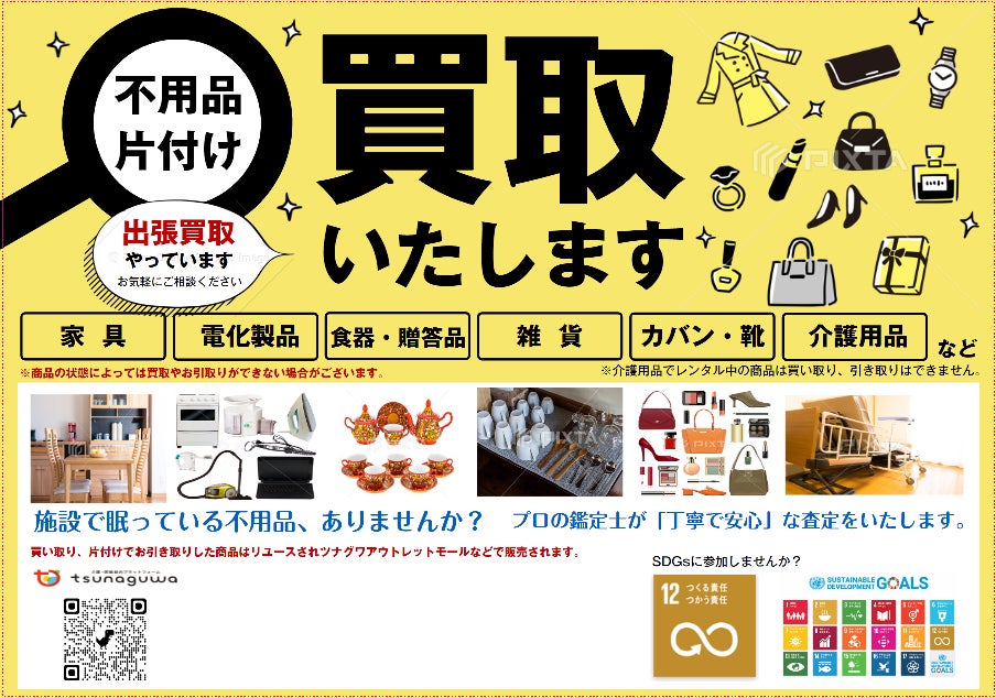 →オムツやベットなど施設の運営に関わる商品を本ポータルサイトを通じて購入いただけます。リユース品やフードロス削減に向けた商品も扱っておりSDGs実現に取り組んでおります。